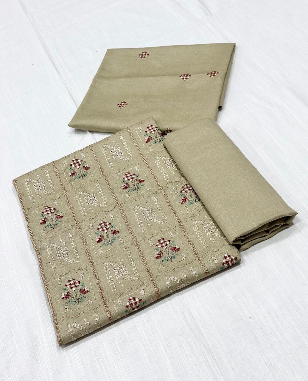 Trouser: Plain dyed Karandi fabric (2.5 meters) in matching tone for a graceful and cohesive finish